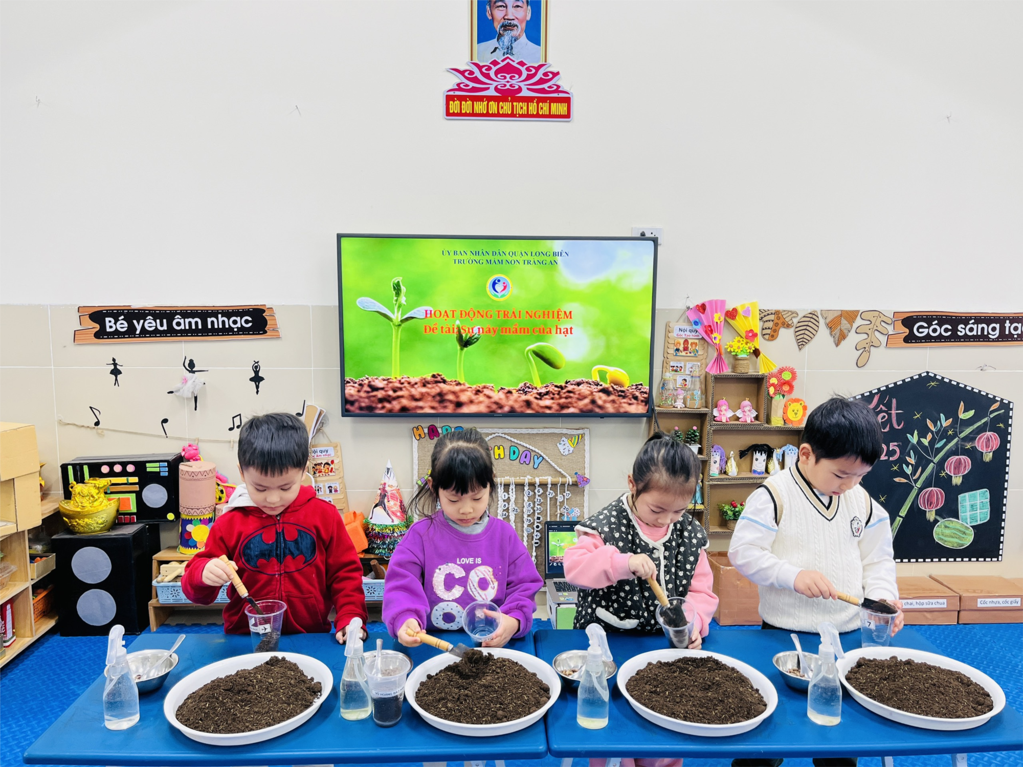 Gieo hạt giống , các con không những được học cách gieo hạt, tưới nước mà còn được theo dõi sự nảy mầm, sinh trưởng và phát triển của cây. Qua đó con cũng được nhận biết, phát triển thêm ngôn ngữ, tên gọi và đặc điểm của một số loại cây và rau mà các con gieo trồng. Hơn thế nữa, công dụng của cây cũng được lồng ghép trong những câu chuyện cô chia sẻ, để con biết trân trọng hơn những loại rau con ăn.