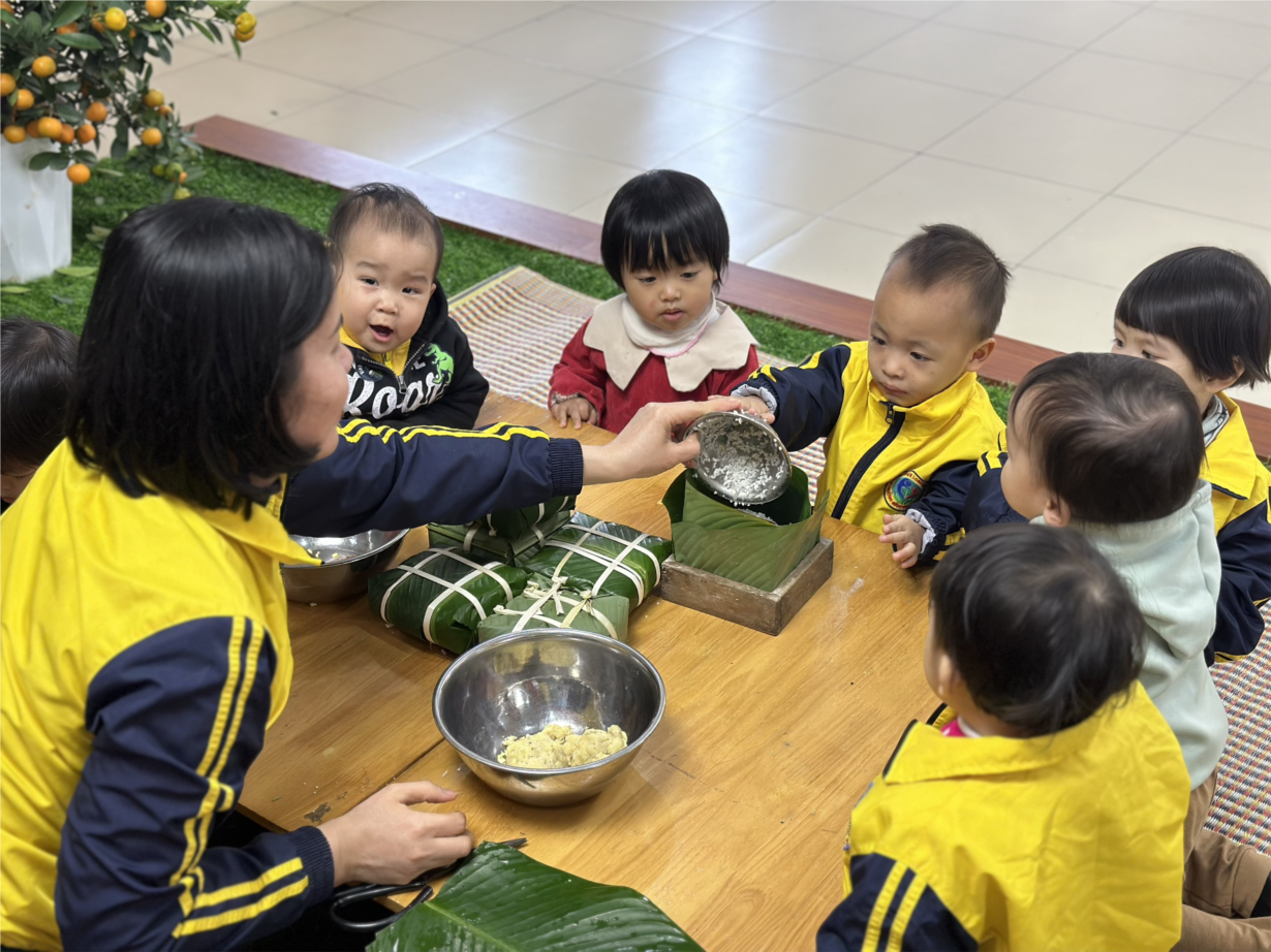 Các bé tỏ ra rất thích thú và hào hứng khi được nhìn các bà,các cô làm một chiếc bánh chưng xanh. Qua đó các con sẽ hiểu thêm về ý nghĩa của những chiếc “Bánh chưng” và ý nghĩa về tình yêu dân tộc, sự gắn kết giữa con người với con người trong ngày Tết cổ truyền dân tộc. Đây cũng là món quà trải nghiệm thật ý nghĩa mà các cô dành tặng các con trước khi đón Tết Giáp Thìn 2024.