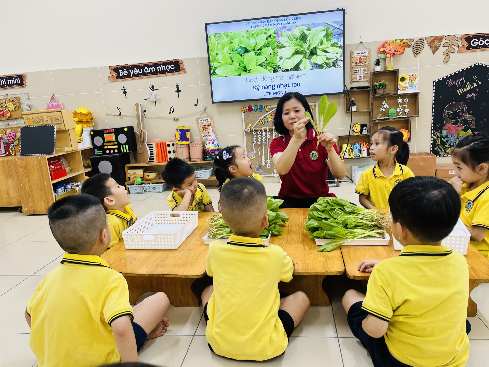 Giờ học kỹ năng nhặt rau cải của các con diễn ra rất sôi nổi và hào hứng . Dạy các con những kĩ năng sống thiết thực cho cuộc sống thường ngày nữa.