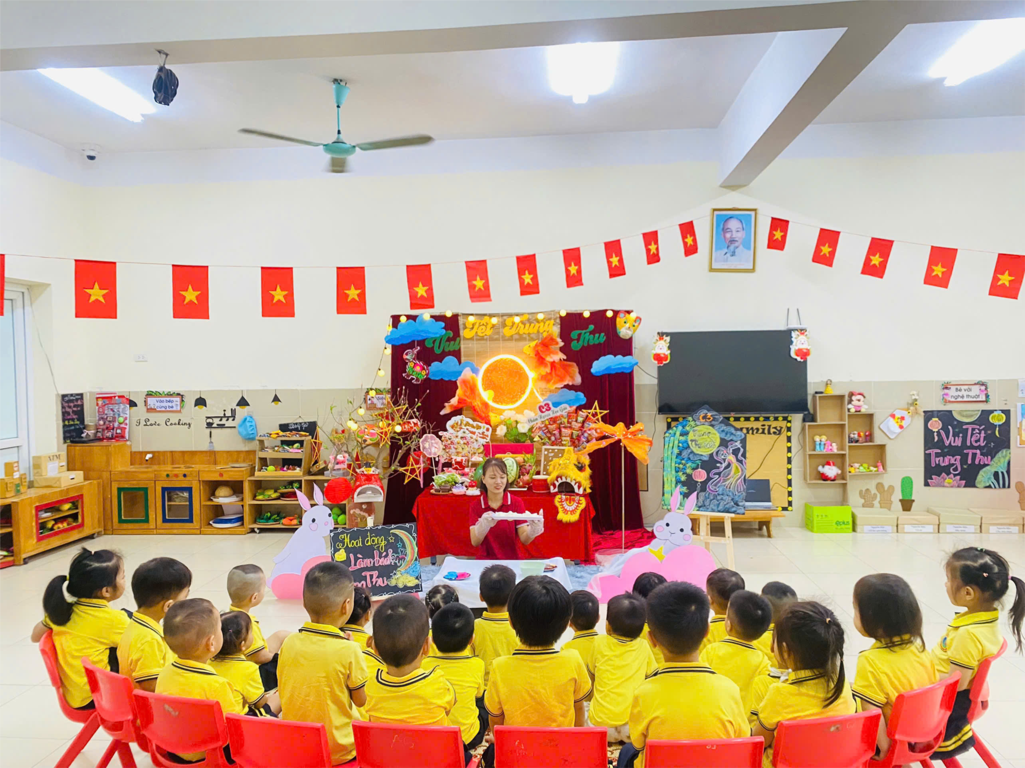 Hòa vào không khí tưng bừng những ngày đầu của năm học mới, cũng như tất cả trẻ em Việt Nam, các bạn nhỏ lớp MGB C3 cũng háo hức mong chờ tết trung thu – tết đoàn viên. Những hoạt động trải nghiệm thú vị đã mang lại cho các con một mùa trung thu vui tươi và đầy ý nghĩa. 🥮🥮Hoạt động trải nghiệm "Bé tập làm bánh Trung thu" giúp cho trẻ biết được cách làm bánh trung thu, rèn cho trẻ có kĩ năng quan sát, ghi nhớ, khéo léo của đôi bàn tay. Hoạt động này cũng giúp cho các bé hiểu thêm về các loại bánh đặc trưng của ngày Tết Trung thu. Chắc hẳn các loại bánh nướng, bánh dẻo trong dịp Tết Trung thu không còn xa lạ gì với các con, bởi chúng được bày bán rất nhiều tại các cửa hàng và dễ dàng mua được. Tuy nhiên bánh nướng, bánh dẻo được làm như thế nào? Nguyên liệu làm bánh gồm có những gì? chắc chắn nhiều bé chưa biết. Để giúp các con hiểu được những chiếc bánh này và có những trải nghiệm thú vị, cô và trò lớp MGB C3 đã cùng tìm hiểu về các loại bánh trung thu và tham gia làm bánh. Các con vô cùng hào hứng và thích thú khi tham gia trải nghiệm này. Sau khi làm xong các con được thưởng thức những chiếc bánh do chính tay mình làm ra. Tuy các con còn bé, khá vụng về, nhưng với sự giúp đỡ của cô những chiếc bánh không được tròn trịa, hoàn hảo nhưng nó lại vô cùng ý nghĩa vì đó chính là do tay mình làm ra. Dưới đây là một số hình ảnh trong buổi trải nghiệm:
