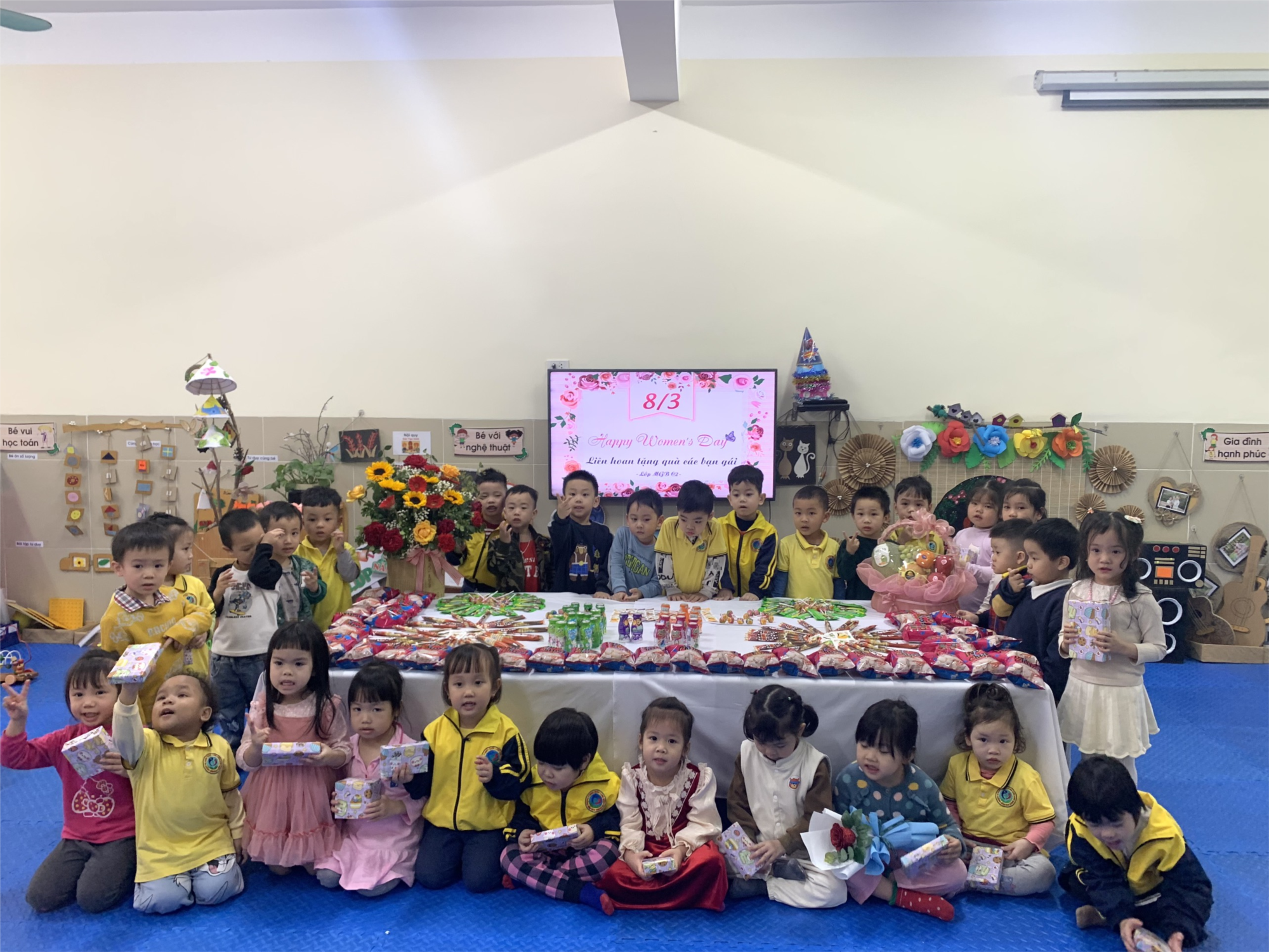 Hoà trong không khí tưng bừng chào mừng ngày Quốc tế Phụ nữ 8/3, các bé lớp MGBC2 đã có những khoảnh khắc vui vẻ, ấm áp bên nhau để cùng nhau có buổi liên hoan ngọt thật là vui. Đặc biệt các bạn hiểu được ý nghĩa của ngày 8/3, biết được ngày 8/3 là ngày của bà,của mẹ, và của các bạn gái. Hôm nay ban phụ huynh lớp rất chu đáo đã chuẩn bị những món quà nhỏ xinh để các bạn trai lên tặng quà cho các bạn gái . Kèm theo món quà không thể thiếu những lời chúc thật đáng yêu mà các bạn trai dành cho bạn . Các bạn gái rất vui và tò mò không biết bên trong chiếc hộp xinh xắn có gì. Niềm vui được thể hiện trên khuôn mặt từng bạn nhỏ.
