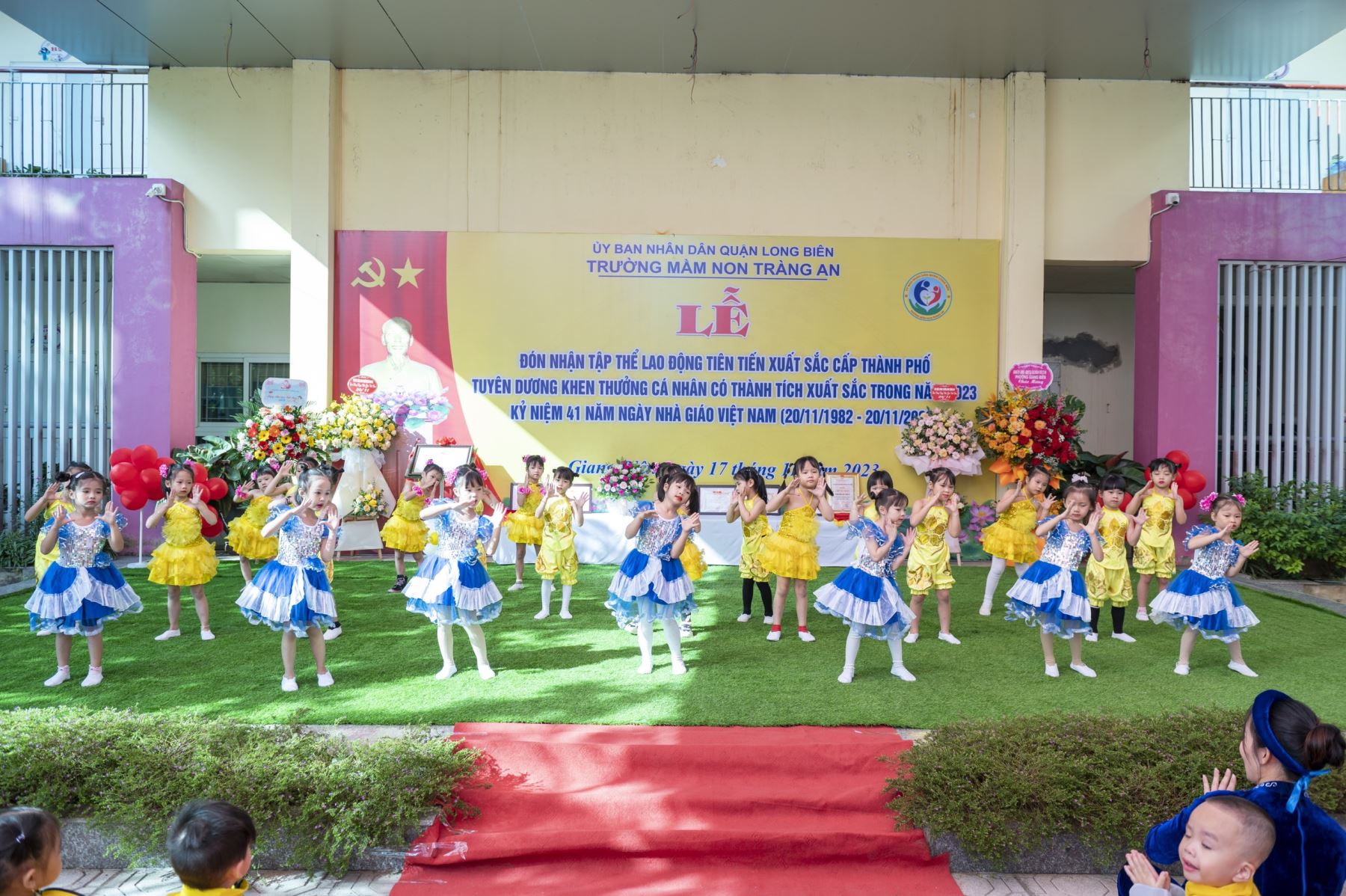 Theo KH hoạt động chào mừng kỷ niệm 41 năm ngày nhà giáo Việt Nam 20/11/1982 - 20/11/2023 và chào mừng 20 năm thành lập quận Long Biên. Nhằm tuyên truyền sâu rộng trong toàn thể nhân dân, cán bộ, giáo viên, nhân viên và học sinh về ý nghĩa của ngày Nhà giáo Việt Nam; khơi dậy đạo lý "tôn sư trọng đạo", lòng tự hào, yêu ngành, yêu nghề; tăng cường sự đoàn kết, gắn bó tình cảm của các thế hệ cán bộ, giáo viên đã và đang công tác tại trường. Hai cô và các bạn nhỏ lớp MGL A1 đã tham gia 2 tiết mục văn nghệ trong "Lễ tuyên dương khen thưởng cá nhân có thành tích xuất sắc trong năm 2023. Kỉ niệm 41 năm ngày nhà giáo Việt Nam 20/11".
