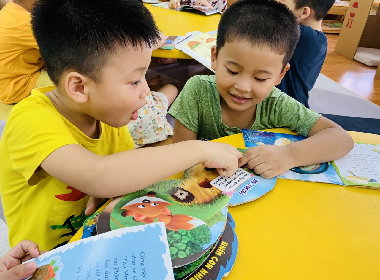 Ngoài giờ học trên lớp, các cô còn cho chúng tớ lên thư viện để khám phá những quyển truyện hay, những quyển sách thú vị nữa đấy. Qua đó giúp chúng mình học hỏi được rất nhiều điều bổ ích và lí thú. Bé Đăng Khoa và Minh Quân rất hào hứng khi được xem truyện tranh với nhiều nhân vật ngộ nghĩnh.
