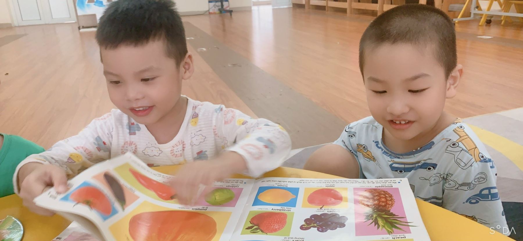 Một bức hình bắt chọn khoảnh khắc vui vẻ, đáng yêu của hai bạn nhỏ lớp A4, đang cùng nhau tìm hiểu về các loại quả. Hai bạn đã rất vui và hào hứng khi xem sách truyện với nhau. Sau những giờ học, giờ chơi thì việc đọc sách hàng tuần luôn đem lại sự hứng thú cho các bé khi đi học.