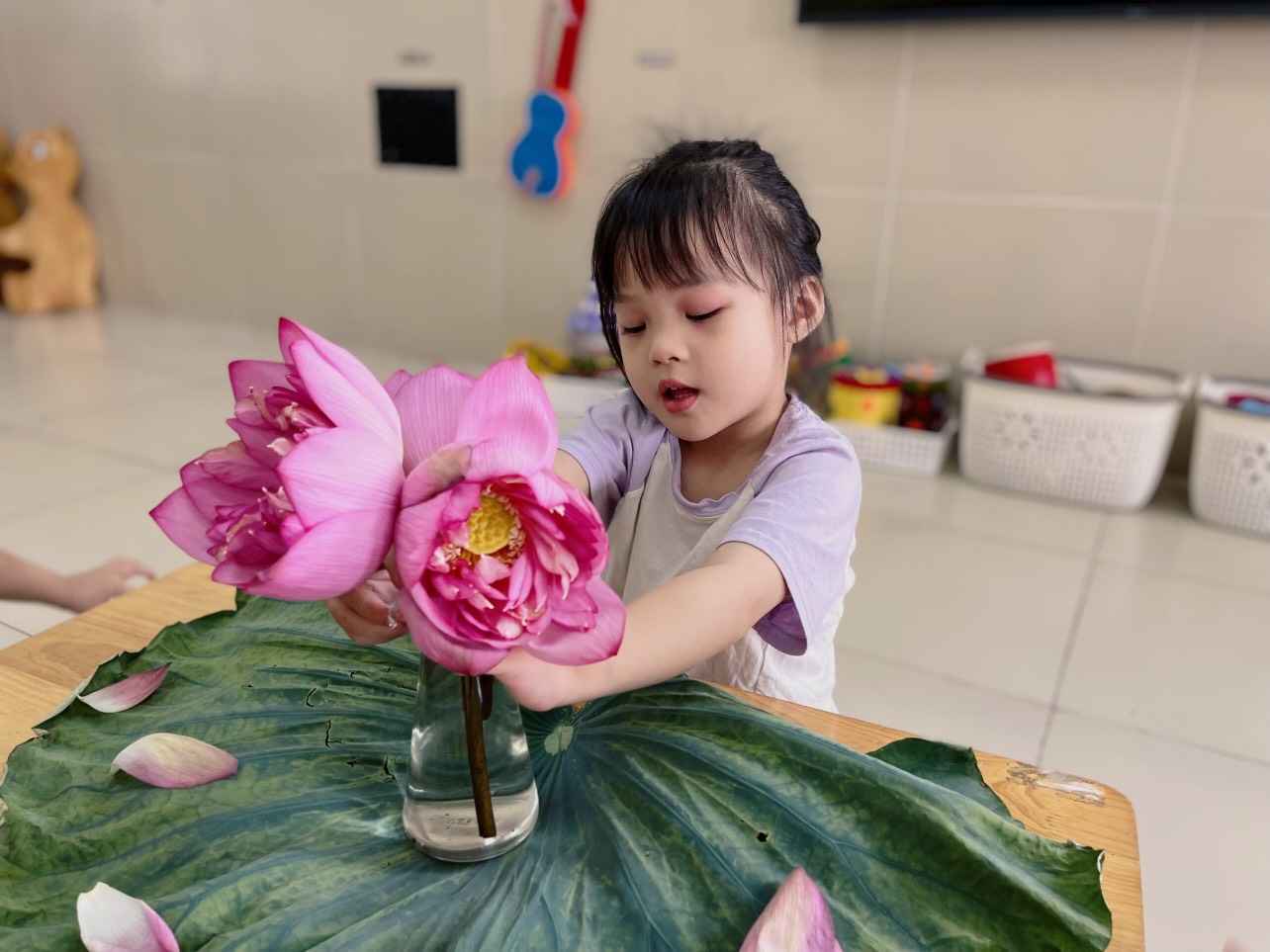 Con là Trương Vũ Mộc An. Ở nhà con còn được gọi là Bánh. Ở lớp, con rất ngoan và biết nghe lời các cô. Khi mới vào học, con nhút nhát, ít nói, thiếu tự tin, không dám nhìn vào người đối diện. Vậy mà sau mấy tháng học ở lớp MGB C1 con đã tiến bộ hơn rất nhiều. Con hay nói, hay hát, biết chơi cùng các bạn, có khi còn chạy ra ôm cô giáo và trêu cô rồi hỏi cô có vui không, cô có buồn cười không. Nhìn khuôn mặt cười vui, thích thú của con khi trêu cô để cô cười thật là xinh xắn, đáng yêu. Hôm nay con còn xinh hơn, đáng yêu hơn bên những bông sen hồng khi say mê tham gia vào hoạt động cắm hoa trong giờ học “Tìm hiểu về hoa sen”. Với làn da trắng, đôi môi đỏ, má ửng hồng, con cũng là một “búp sen nhỏ” đáng yêu trong lòng các cô.
