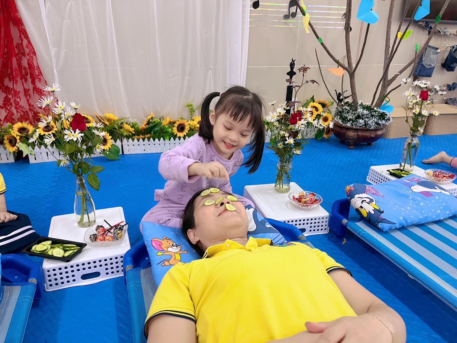 "Cô ơi, cô nằm xuống đây đi để con đắp mặt nạ dưa leo cho cô". Cô giáo thật cảm động trước lời mời và tình cảm chân thành của bé Mộc An đối với cô. Cô rất vui vì được nằm thư giãn nghe nhạc nhẹ và cảm nhận da mặt đang căng mát. Cô còn vui hơn vì nhận được tình cảm yêu quý của con. Con đã lớn hơn rất nhiều, biết quan tâm đến cô giáo và các bạn rồi đấy. Hãy luôn là cô bé ngoan của lớp C1 con nhé.