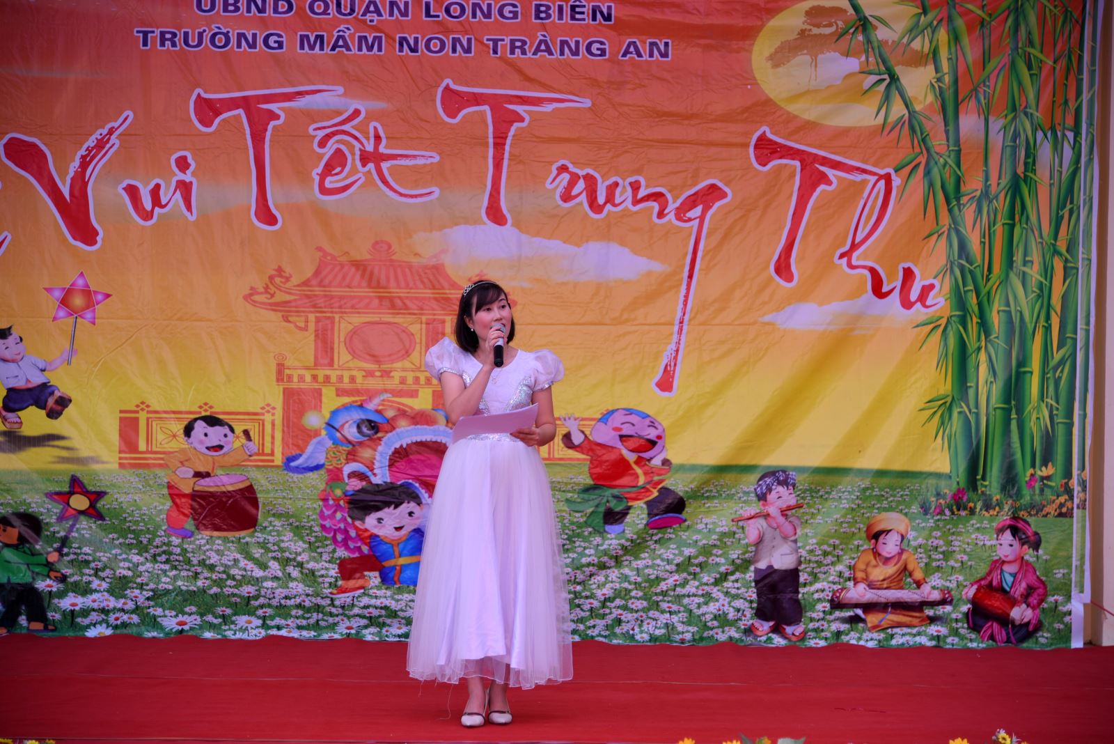 Chương trình diễn ra trong không khí tưng bừng, náo nhiệt với màn biểu diễn Múa Lân vui nhộn và các tiết mục văn nghệ đặc sắc do cô và cháu là học sinh của trường (Là học viên lớp năng khiếu của Trung tâm VHTT&TT Quận Long Biên biểu diễn). Cùng với sự hài ước, dí dỏm của chị Hằng, chú Cuội và một số nhân vật trong những câu chuyện cổ tích đáng yêu...đã dẫn các bé đến với những câu truyện cổ tích (Thế giới của những điều kỳ diệu, thế giới của tình yêu thương…). Từ đó, giáo dục cho các bé biết chia sẻ, đoàn kết để tạo nên sức mạnh, lòng vị tha, nhân hậu, biết yêu thương con người và vạn vật xung quanh mình.